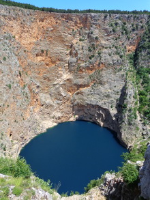 Crveno jezero (Sarkanais ezers) pie Imotsku pilsētiņas Horvātijā. Sarkans tāpēc, ka krasti tādi. |