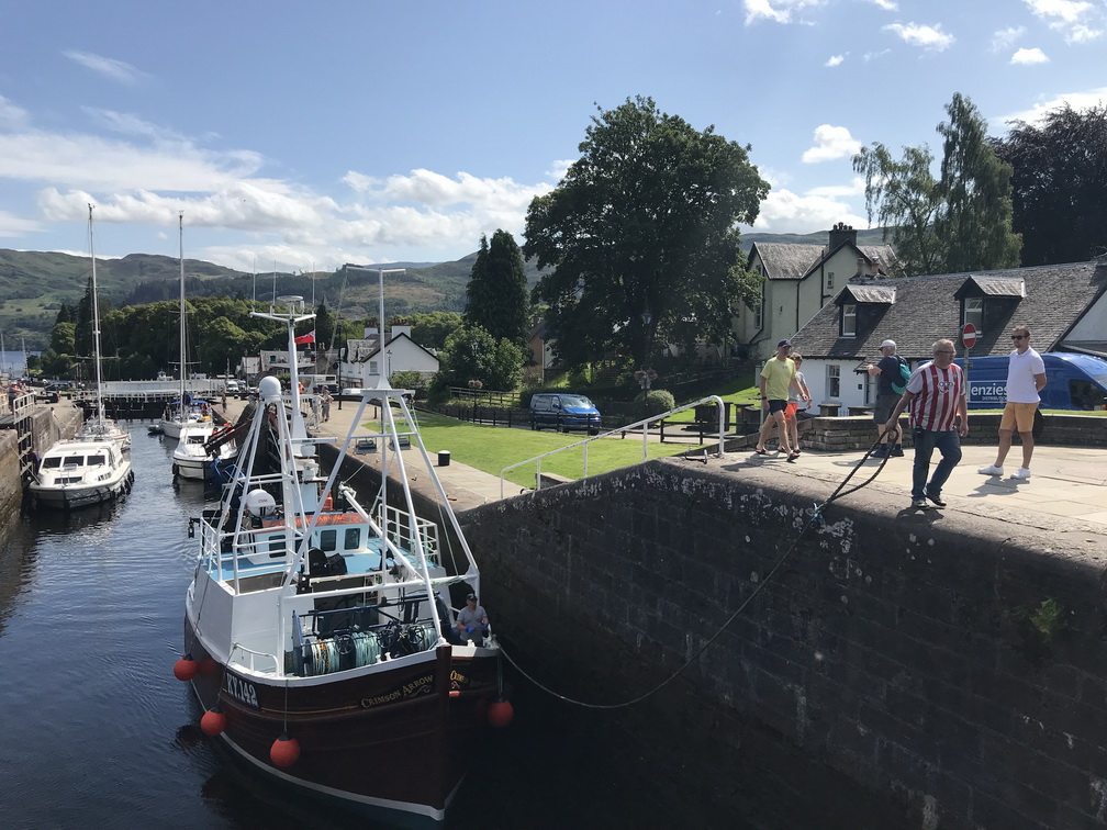 Tā nu patiesi gleznainajā, pozitīva miera caurstrāvotajā Fort Augustas pilsētiņā vērojam brīnišķu skatu kā viena pēc otras tiek atvērtas slūžas, kā mainās ūdens līmenis, kā kuģīši un jahtas cēli spraucas cauri, kā komanda met virves, tauvojas, pievelkas un ceļas augstāk, tiek uz priekšu, plašākos ūdeņos Aiz Neptūna kāpnēm ir paplašināta osta, kur laiskojas kuģi, jahtas un to iemītnieki. Citi sauļojas, citi lec peldēt, bet vēl kāds pilda jogas vingrinājumus. Jā, te pozitīvisma un lokālā kolorīta netrūkst tiešām patīkama vieta! Jau kanāla celšanas laikā karaliene Viktorija personiski apbraukājusi būvi un esot bijusi sajūsmā. Sākotnēji kanāls bijis domāts galvenokārt kravu pārvadāšanai un nodrošinājis satiksmi pat 45,7 metrus gariem kuģiem. Salīdzinoši drīz tas kļuvis par transporta kuģīšu ceļu, bet tagad kalpo galvenokārt izklaides ceļotājiem. Braukšana caur slūžām ir maksas pasākums, bet mierīgā kuģošana un estētiskais baudījums ir to vērts.