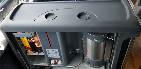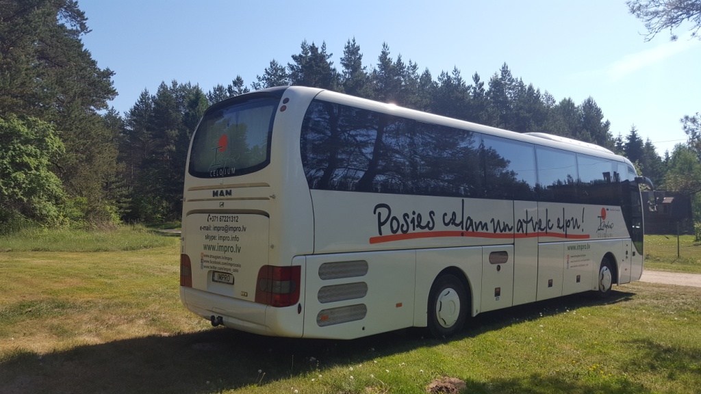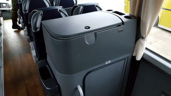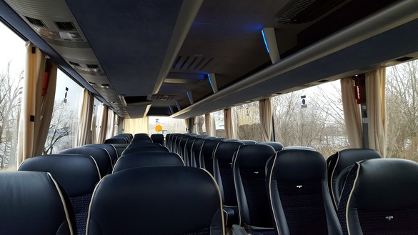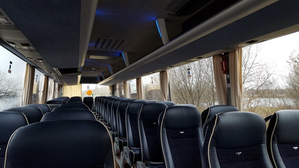 CD atskaņotājs, DVD, videosistēma - 2 monitori, mikrofons, ūdens vārāmais aparāts (pēc pasūtījuma kafija, tēja, buljons, vienreizējie trauki), WC, gaisa kondicionieris, mobīlais telefons